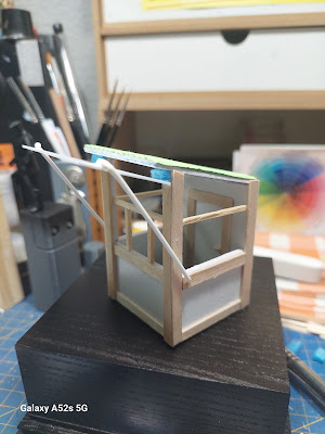 El techo es un papel ondulado que encontré en una papelería hace tiempo y que guardé precisamente para simular la uralita. Posteriormente al recibir un lavado de cola blanca diluida en agua, hago que ese papel endurezca para poder recibir los tratamientos necesarios de pintura.